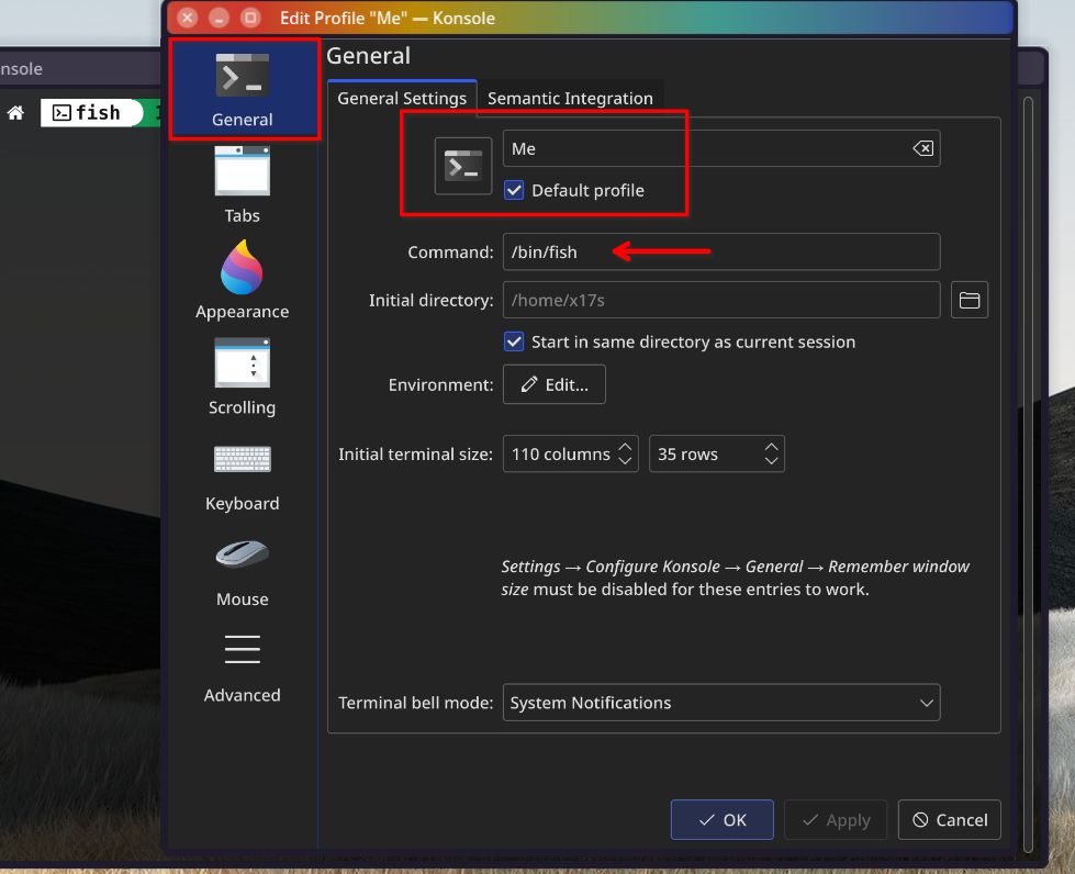 - Tab General >> create-new-name & checklist default >> command (/bin/fish) >> apply & Ok >> Close terminal