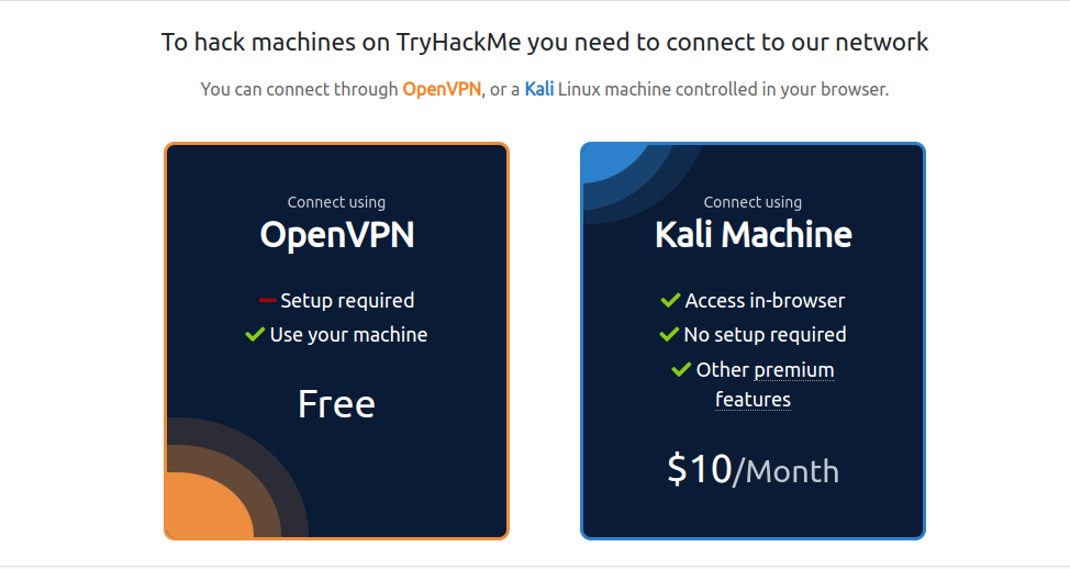 Sedikitnya ada dua opsi user untuk bermain CTF di THM ini, yaitu dengan OpenVPN (Free + Req. Setup) dan Kali Machine (Monthly payment - premium++) seperti gambar berikut: